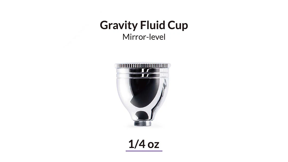En resumen, la copa de fluido por gravedad con acabado tipo espejo proporciona una alimentación eficiente de pintura, es ideal para trabajos detallados, reduce el desperdicio, permite cambios rápidos de color y mejora el control general durante el aerografiado.