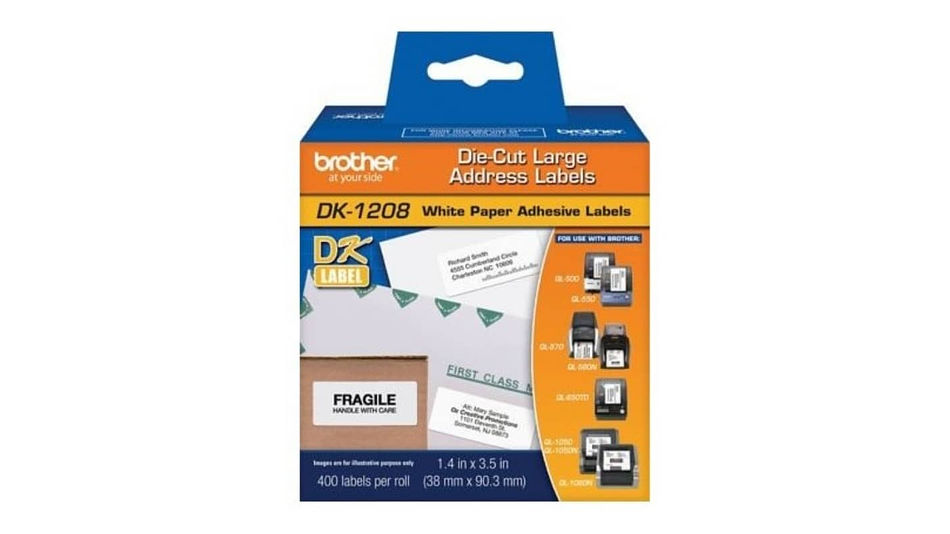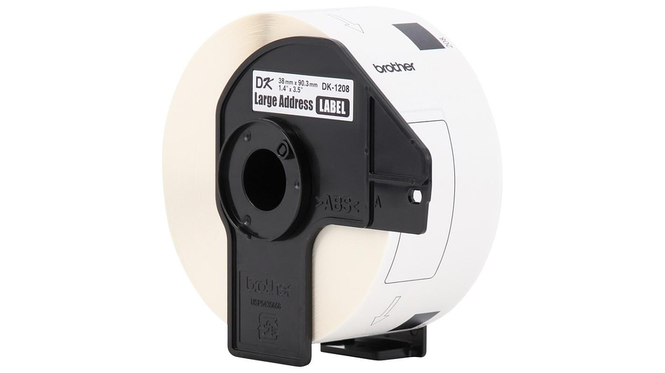 BROTHER DK-1208 | DK1208 | Cinta de etiquetas fondo Blanco - Texto Negro | 400 etiquetas pre cortadas de 38 milímetros de ancho x 90 milímetros de largo | papel térmico y con adhesivo industrial