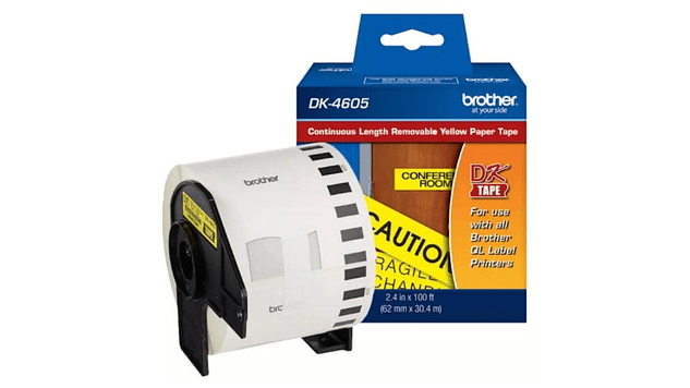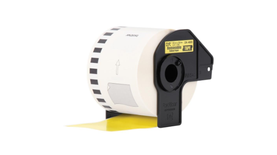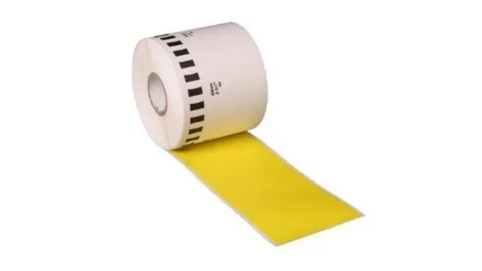 BROTHER DK-4605 | DK4605 | Cinta de etiquetas fondo Amarillo - Texto Negro | 62 milímetros de ancho x 30,48 metros de largo papel térmico y con adhesivo industrial