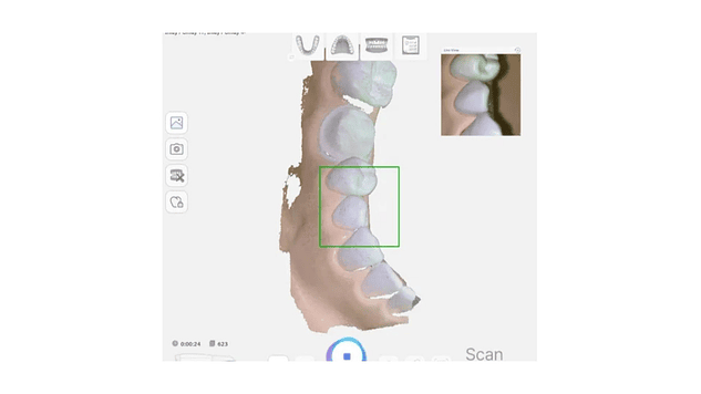 Proporciona un escaneo en color real que puede distinguir entre los dientes y el tejido blando de la boca.