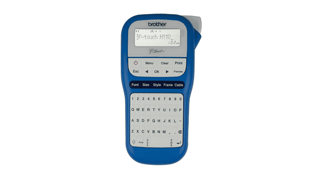 Organiza fácilmente tus archivos de oficina, cajas de CD, estantes y otros artículos con el P-touch H110. Crea etiquetas duraderas y coloridas en segundos. Es ideal para la casa, la oficina en el hogar y para usar en cualquier lugar. Presenta un teclado QWERTY con prácticas teclas de un solo toque, y una pantalla gráfica con vista previa para revisar sus etiquetas antes imprimirlas. Personalice fácilmente sus etiquetas con distintas fuentes, encuadres y más de 250 símbolos. También es útil para organizar sus alambres y cables con la práctica función de etiquetado de cable. Crea etiquetas con 1 o 2 renglones de texto. La memoria integrada guarda hasta 15 etiquetas para reimprimirlas con rapidez. Utiliza cinta "TZe" duradera, laminada y fácil de despegar de hasta 12 mm de ancho (~1/2"). Funciona con 6 baterías "AAA" o un adaptador opcional de CA (NO INCLUIDOS)