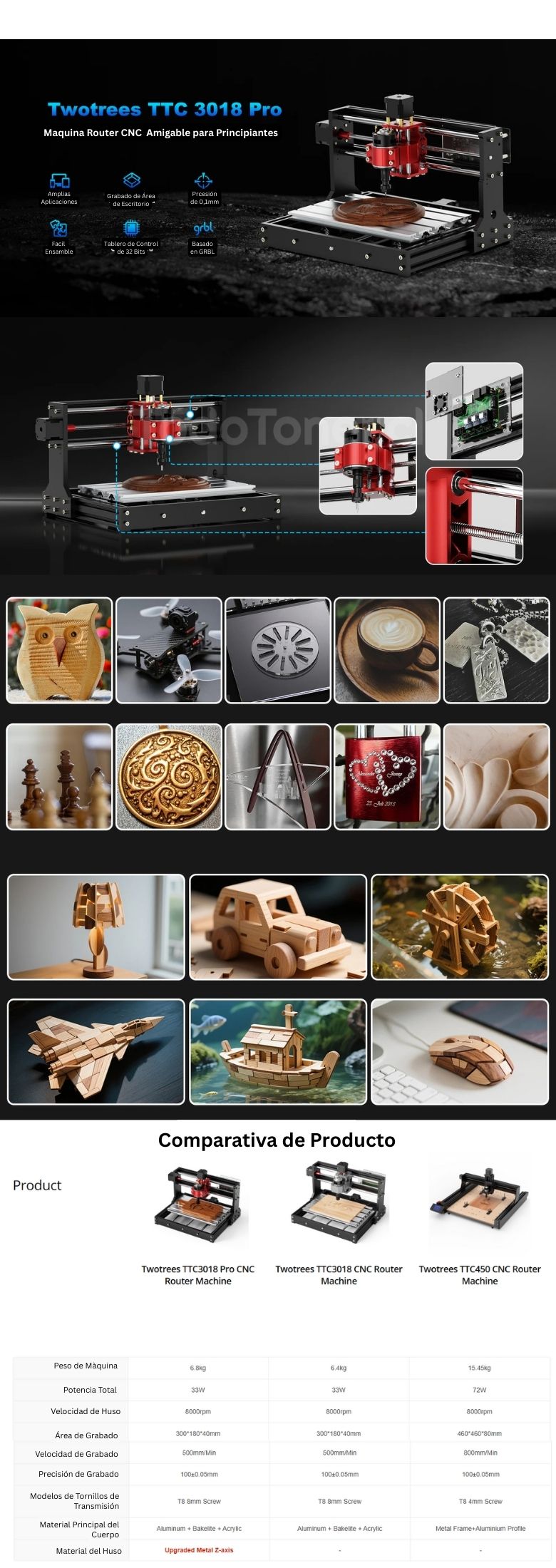 -Versatilidad en Materiales y AplicacionesLa TTC3018 Pro es compatible con una amplia variedad de materiales, desde madera y plásticos hasta metales blandos. Además, puede equiparse con módulos láser opcionales (como los de 5W o 10W de TwoTrees) para realizar grabados láser en superficies como madera, cuero, papel o acrílico, ampliando aún más sus capacidades.
