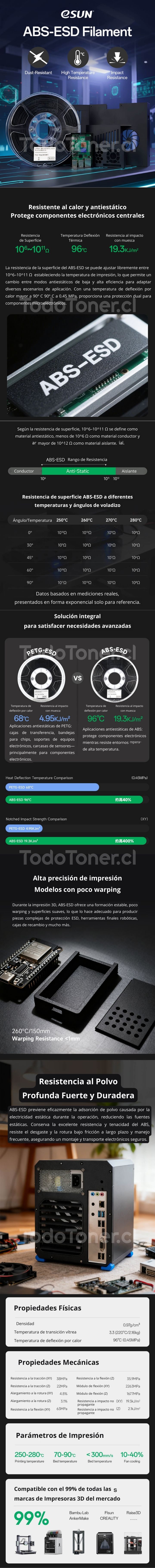 Recomendado secar antes de usar (para óptimos resultados) y usar en impresoras con cama caliente. Perfecto para carcasas electrónicas, soportes de componentes sensibles, herramientas ESD, piezas para industria electrónica, prototipos funcionales y entornos con riesgo de acumulación de carga estática.