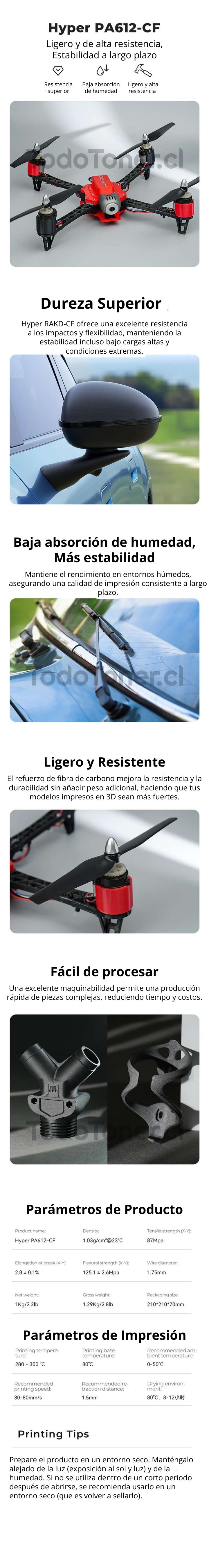 El Filamento Hyper PA612-CF Creality 1 kg Negro (SKU 3301060035) es un filamento avanzado reforzado con fibra de carbono (CF), diseñado para impresoras 3D Creality y cualquier impresora compatible con diámetro de 1.75 mm. Este material combina la resistencia extrema del PA (nylon) con la rigidez y estabilidad de la fibra de carbono, ofreciendo propiedades superiores: alta resistencia a impactos, tracción, flexión, abrasión y temperaturas elevadas, con mínima contracción y deformación. Ideal para piezas funcionales de alto rendimiento, piezas mecánicas, herramientas, prototipos industriales y aplicaciones exigentes. El color negro profundo con efecto carbono da un acabado técnico y premium, perfecto para proyectos profesionales e industriales en Chile.
