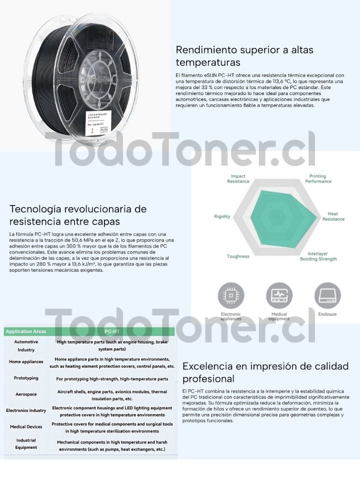 Excelente para impresoras con boquilla de alta temperatura, cama caliente y entornos controlados. Ideal para carcasas electrónicas, piezas automotriz, herramientas, soportes resistentes al calor, prototipos industriales y componentes que requieren alta resistencia térmica y mecánica.