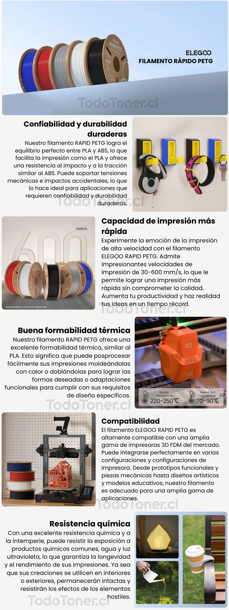 El Filamento para Impresión 3D ELEGOO PETG de Alta Velocidad es un material avanzado diseñado para ofrecer una impresión rápida, precisa y confiable, ideal para creadores, diseñadores y talleres que buscan optimizar la productividad sin comprometer la calidad. Este filamento combina la facilidad de impresión del PLA con la resistencia y durabilidad del ABS, ofreciendo un equilibrio perfecto para una amplia gama de aplicaciones. Con su capacidad para soportar altas velocidades de hasta 600 mm/s, excelente estabilidad dimensional y resistencia química, es ideal para prototipos funcionales, piezas estructurales y modelos artísticos. En TodoToner.cl, distribuidor exclusivo en Chile con más de 30 años de experiencia brindando el mejor servicio y los mejores productos, encontrarás este filamento y todo lo que más te guste y requieras para tus proyectos, con envíos exclusivos dentro de Chile.