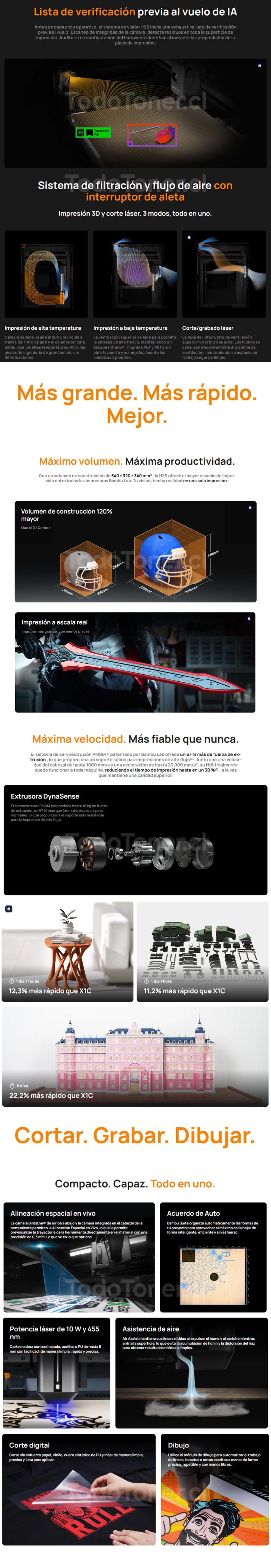 Eficiencia Operativa: Experiencia "out-of-the-box" con 95% de preensamblaje, checklist AI pre-vuelo y sistema de ventilación con solapas para modos de impresión de alta/baja temperatura y corte láser, optimizando flujos de trabajo sin interrupciones.