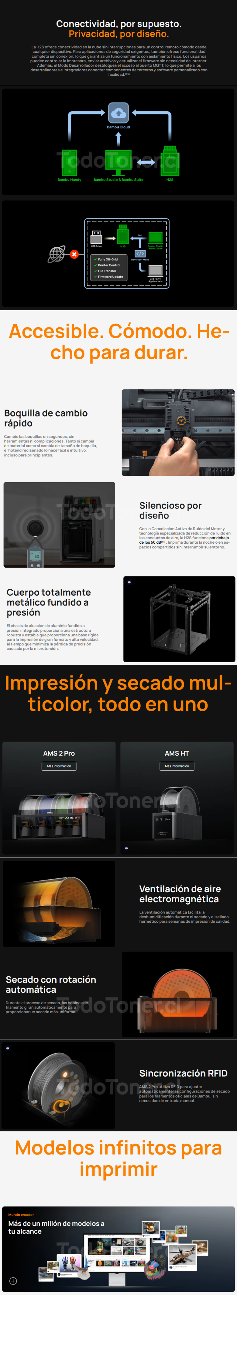 Nota importante: La versión H2S AMS Combo incluye el AMS 2 Pro de serie, que habilita impresiones multicolor con hasta 24 colores simultáneos mediante hasta 4 unidades AMS 2 Pro y 8 AMS HT, con secado automático rotatorio y sellado electromagnético para mantener la humedad baja.