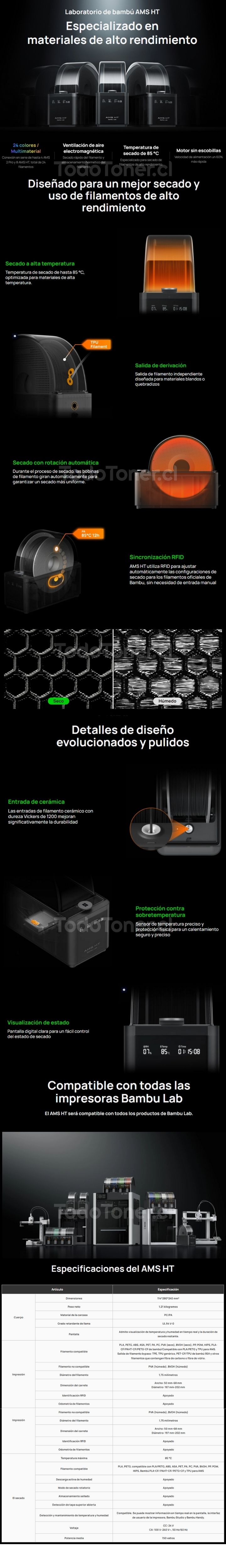 El AMS HT de Bambu Lab es un Sistema Automático de Materiales avanzado diseñado para el secado y almacenamiento de filamentos de alto rendimiento. Equipado con ventilación electro-magnética y secado activo a 85°C, garantiza una deshumidificación rápida e inteligente. Su diseño hermético permite almacenar filamentos sin humedad, soportando hasta 24 colores o materiales en configuraciones multi-impresora. Incluye un motor sin escobillas para una alimentación 60% más rápida, sincronización RFID para filamentos oficiales y una entrada cerámica de alta durabilidad (dureza Vickers 1200). Con protección contra sobrecalentamiento y monitoreo en tiempo real, es ideal para materiales como PLA, PETG, ABS, ASA, PET, PA, PC, y más.