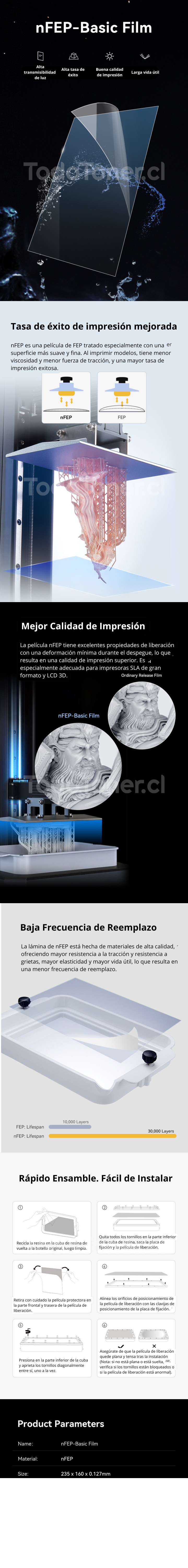 El Pack de Películas FEP Creality (5 Piezas) es el repuesto original de películas FEP para impresoras de resina Creality. Estas películas garantizan una separación limpia y suave de la pieza impresa, reduciendo fallos de adherencia, mejorando la calidad de superficie y prolongando la vida útil de la plataforma de impresión. Resistentes a altas temperaturas y compatibles con resinas estándar y técnicas. Cada película tiene medidas: 234 × 160 × 0.127 mm. Pack económico ideal para reemplazos frecuentes o stock de repuesto. Compatible con modelos Creality de resina que usan películas FEP de estas dimensiones.