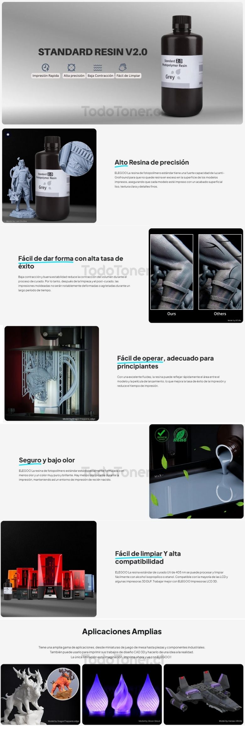 La Resina ELEGOO Estándar V2.0 combina alta precisión, curado rápido y bajo olor, ofreciendo un material ideal para una amplia gama de aplicaciones, desde miniaturas y modelos dentales hasta piezas industriales. Su compatibilidad con impresoras 3D LCD y DLP, junto con su facilidad de uso, la convierten en una opción versátil para creadores de todos los niveles. En TodoToner.cl, distribuidor exclusivo en Chile con más de 30 años de experiencia brindando el mejor servicio y los mejores productos, te ofrecemos esta resina y una amplia gama de productos para que encuentres lo que más te guste y requieras, con envíos exclusivos dentro de Chile.